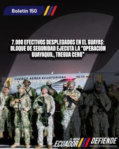 Guayas (Guayaquil). – Desde ayer, el Bloque de Seguridad desplegó 7.000 policias y militares en distintos cantones de la provincia del Guayas, con énfasis en Guayaquil y Durán, para fortalecer el control territorial y ejecutar operaciones de alta intensidad en el marco de la “Operación Guayaquil, Tregua Cero”.