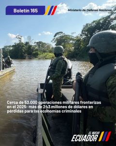 El Gobierno Nacional, a través del Ministerio de Defensa y las Fuerzas Armadas, mantiene un despliegue permanente en la protección de las fronteras del Ecuador. Durante el 2025, se han ejecutado cerca de 53.000 operaciones militares en los límites terrestre, marítimo y aéreo, destinadas a impedir la acción de redes vinculadas al narcotráfico, el contrabando, la minería ilegal y otros delitos transfronterizos.