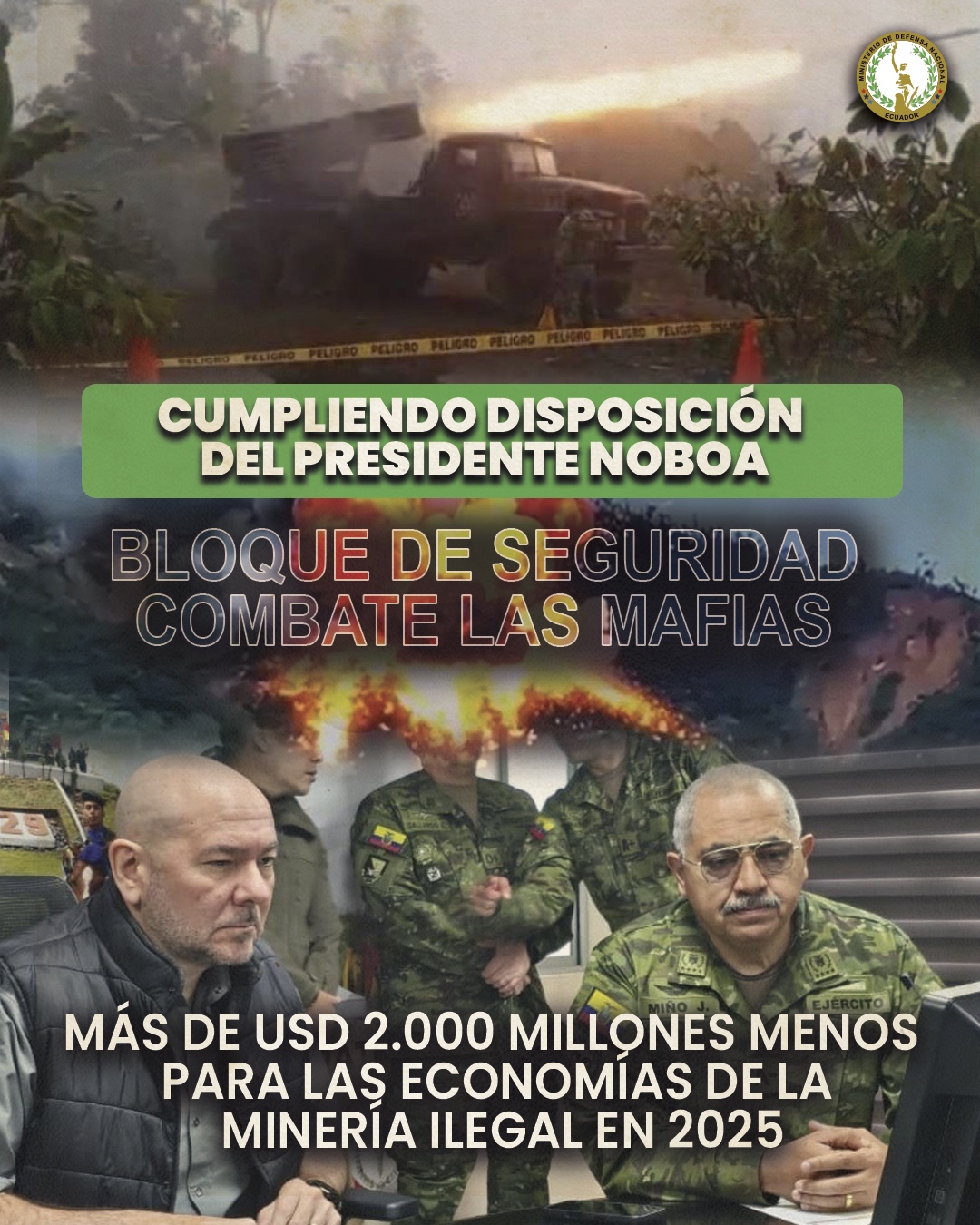 CUMPLIENDO DISPOSICIÓN DEL PRESIDENTE NOBOA, BLOQUE DE SEGURIDAD COMBATE LAS MAFIAS: MÁS DE USD 2.000 MILLONES MENOS PARA LAS ECONOMÍAS DE LA MINERÍA ILEGAL EN 2025